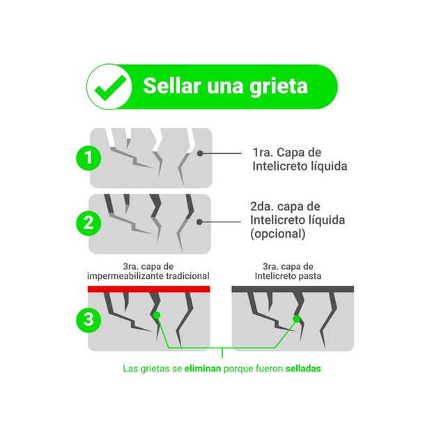 Conoce los 5 pasos para aplicar INTELICRETO® en una superficie de concreto para: Reparar grietas, eliminar humedades, eliminar salitre, evitar filtraciones, mejorar el rendimiento de pintura e impermeabilizantes y mucho más.